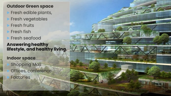 Edible and still growing plants, vegetables, fruit, medicinal plants and fish/crustacea are supplied by our smart farming to the specially designed green space with fish/crustacea tanks at the roof garden, covering the Complex. Each green space is equipped with an AI technology-assisted gardener looking after multiple gardens. The complex is equipped with a watering and an artificial rain system to keep vegetables, plants and fish/crustacea alive which also cools the building and has rainwater retention.